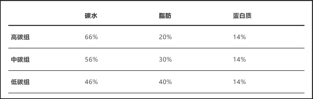 受试者被分成3组,碳水的摄入量分为高、中、低组,蛋白质摄入相同,总热量摄入相同。